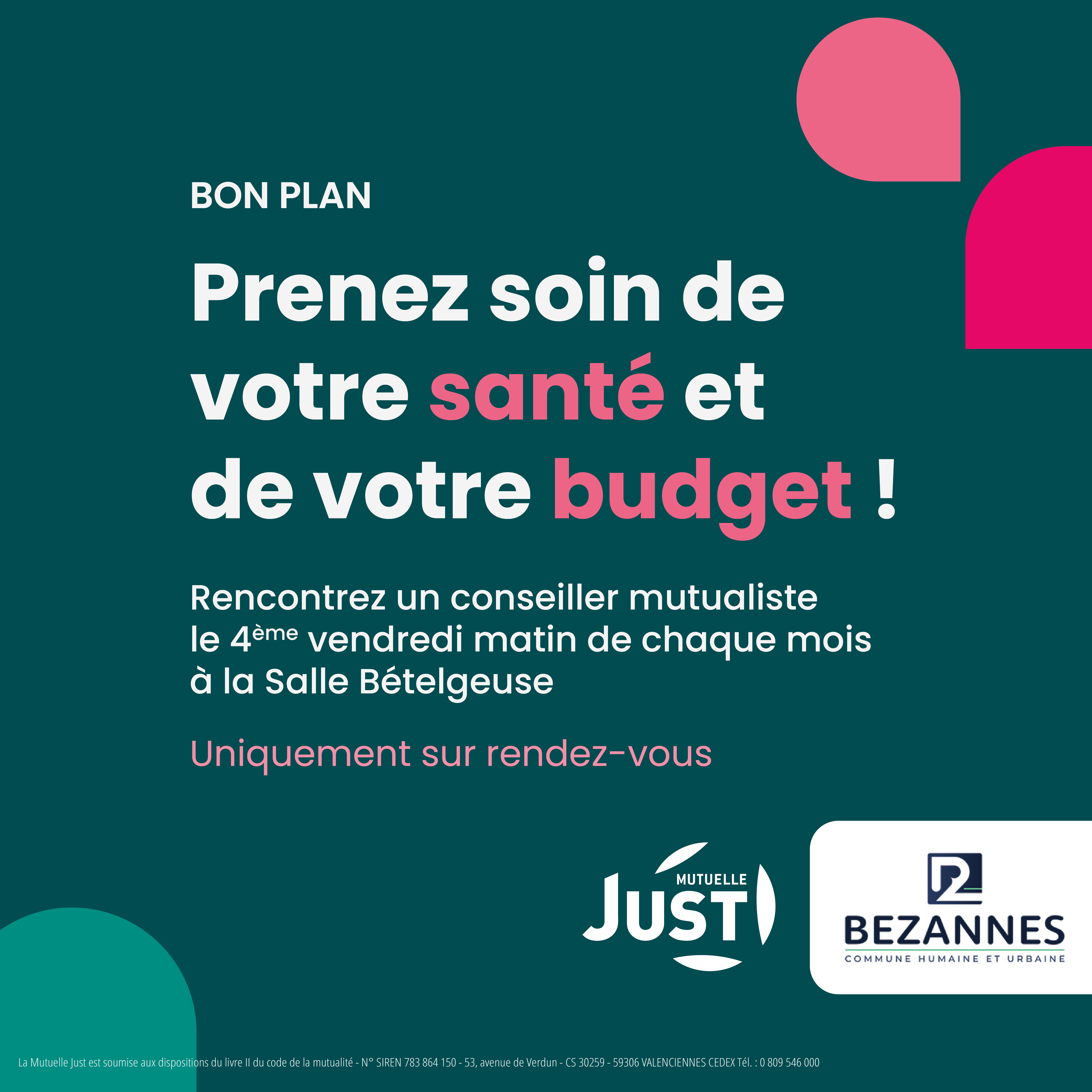 Nous vous invitons à choisir votre créneau de rendez-vous en appelant la Mutuelle Just au 0 809 546 000 (service gratuit + prix de l’appel) du lundi au vendredi de 9h à 17h30 ou directement en vous rendant sur le site Internet de la Mutuelle Just. Pour choisir votre créneau de RDV, saisissez "Bezannes" sur le site https://www.just.fr/rdv