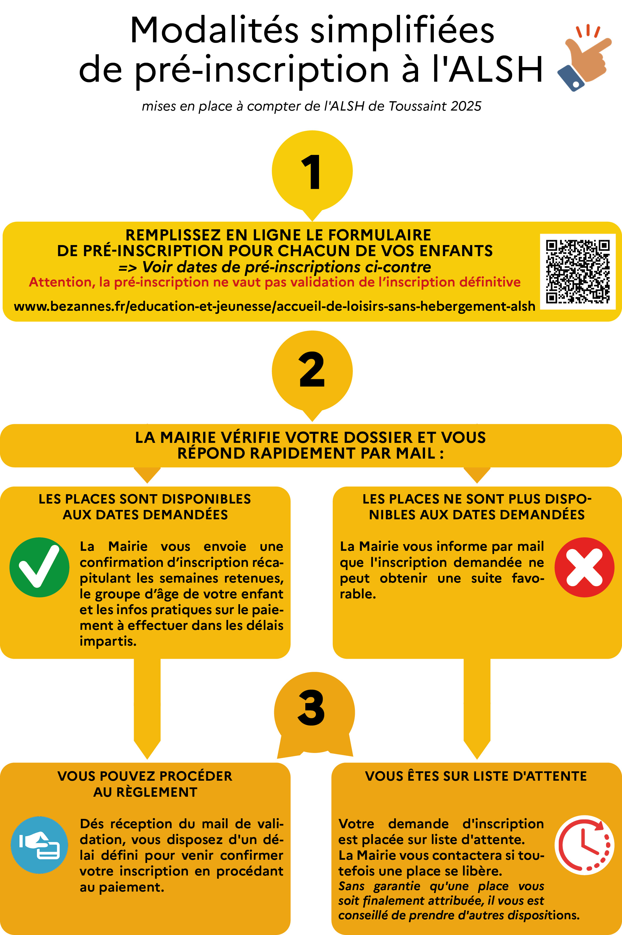 Les inscriptions sur place en mairie restent possibles. Toutefois, le nombre de places étant limité, il est vivement conseillé d’utiliser la pré-inscription en ligne, plus rapide et sécurisée. Ce mode d’inscription vous donne davantage de chances d’obtenir les dates souhaitées pour vos enfants.