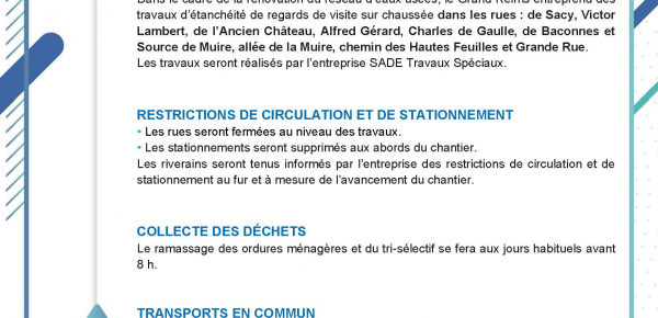 Dans le cadre de la rénovation du réseau d’eaux usées, le Grand Reims entreprend des travaux d’étanchéité de regards de visite sur chaussée dans les secteurs suivants :